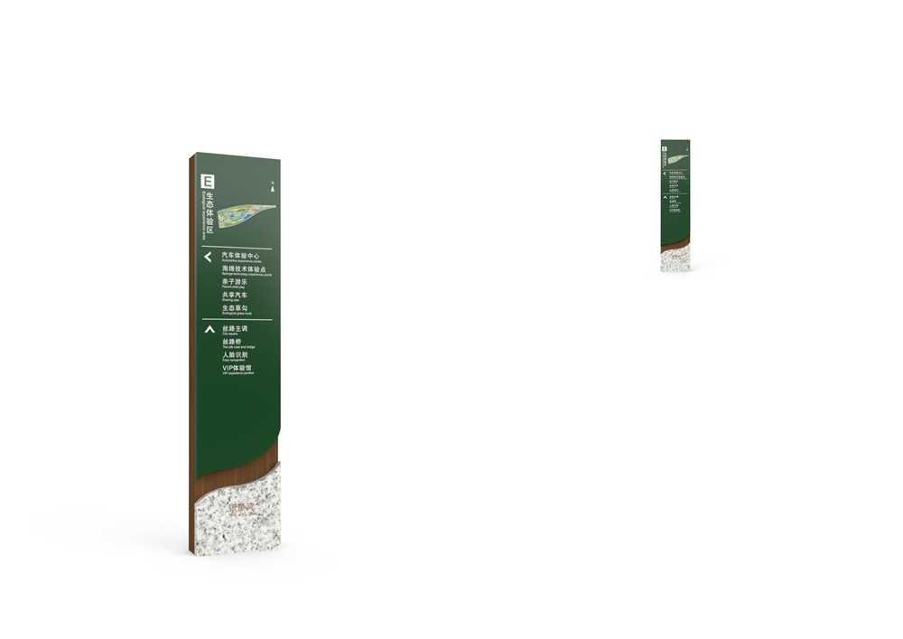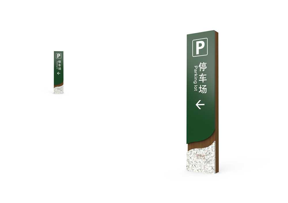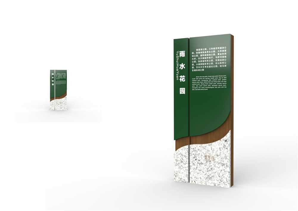 一標注出來,只要你一進入公園就可以將公園的結構看得一清二楚。在設計時應考慮既不能破壞園林整體氣氛,又可以達到引導、吸引游客的目的。由于范圍廣泛,園林的導視密度相對降低,體量感相對增大,而且導視系統設計風格、色彩統一性,以及形式感都可以相對自由、新穎,給人深刻印象。